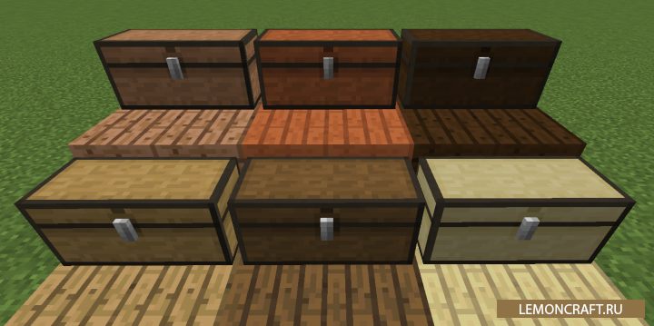 Мод на предметы и блоки из дерева I Like Wood добавит в игру большое количество новых предметов и блоков из дерева, цветовая гамма которых будет соответствовать материалу из которых они созданы. В игре появятся новые заборы, бочки, сундуки, кровати и верстаки. Все предметы можно создать из темного и светлого дуба, акации, березы, дерева из джунглей и ели.